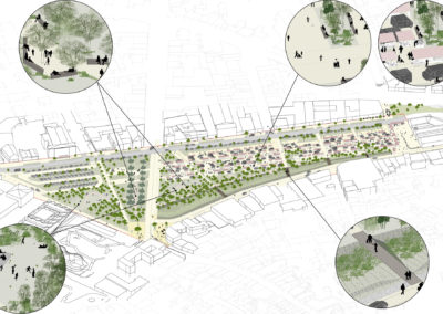 L’ambition est bien d’étendre la qualité paysagère initiée à l’Ouest en renforcer la composante végétale pour ancrer les places dans leur environnement direct et pour améliorer la résilience des espaces centraux.